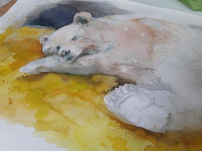 No joo, Rafael Wardi on ollut nyt sitten mielessä monta päivää. Ja menin viikonloppuna maalaamaan keskeneräisen karhuakvarellinkin keltaiseksi. :) Ehkä siitä tulee teos “Wardin karhu näkee keltaista unta”- tai sitten ei.