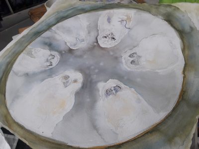 Alla aivan keskeneräinen pöllömaalaus, jota olen vähän miettinyt viime päivinä. Saa nähdä tuleeko siitä mitään. Jotenkin tykkään tässä vaiheessa tähtitaivaasta, ympyrästä joka on kuin kompassi tai kello, vanhasta tunnelmasta ja vakavista pöllöistä. Kun näytin tätä alkua pojalleni niin hän sanoi lakonisesti: Ai teos “Kaivon pohjalla pöllönpoikasten vankina”. Aika hyvä ja nyt on mahdotonta nähdä tätä enää toisin! – mutta toisaalta: tuore aihe, josta on harvoin tehty maalauksia. :)