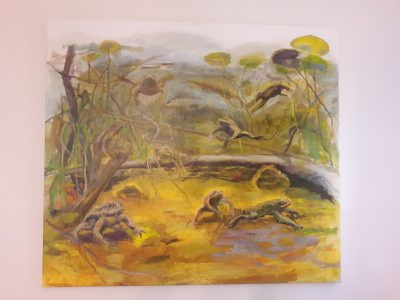 Maalasin nyt loppukesällä öljymaalausta rupikonnalammesta. Tämä liittyy vuosien takaiseen kokemukseen, kun pääsin kuivapuvussa sukeltamaan vedenalaiskuvaaja Pekka Tuurin kanssa rupikonnien kutulampeen. Kuvasimme lammelta Ulos luontoon- jaksoa. Oli hienoa nähdä rupikonnat siellä vedessä. Ne istuskelivat pohjalla ja vedenalaisten puunrunkojen päällä ja ponnahtivat välillä uimaan- näytti vähän siltä kuin ne olisivat lentäneet.