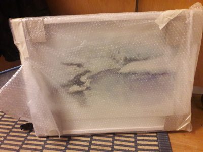Talvinen koskikaramaalaus lähti tänään työkaverini kyydissä synttäriyllätykseksi. Toivottavasti lahjan saaja on jäisten vesien ja koskikarojen ystävä.