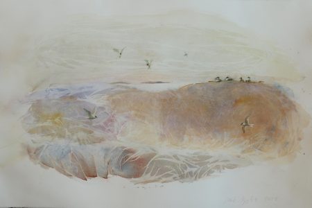 Tähän alla olevaan akvarelliin olen yrittänyt saada tallennettua sen keveyden ja kuulauden, jota meren rannalla voi kokea joskus kevätiltoina ja -aamuina.