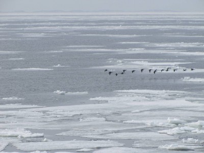 Huippukevätpäivä. Tuuli kuljetti jäälauttoja merellä yllättävän nopeasti. Ne täyttivät sataman väylän ja saivat haahkalautat siirtymään etelämmäs. Pääsimme näkemään kohmeisen kyyn, ja päivän kohokohtana lumella köllöttelevän kuutin. Illalla olimme koululla kottaraispönttötalkoissa ja syömässä pannukakkua. Kottaraiset näyttivät odottelevan jo kärsimättöminä lähipuissa kotiensa valmistumista.