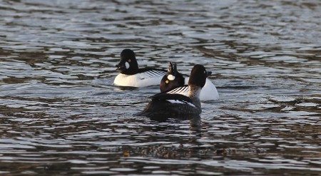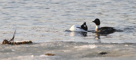 Lapset nukkuivat pitkään. Lainasin Juhan kameraa, ja kuvasin telkkiä kotisatamassa. Oli hauska seurata, miten kolme koirasta piiritti yhtä telkkänaarasta, ja heitteli vuorotellen päätään taaksepäin. Yksi niistä oli selvästi muita aktiivisempi, ja ui aivan naaraan kyljessä muiden kahden tyytyessä seuraamaan paria hiukan kauempana. Ensimmäinen koiras keskeytti välillä pullistelunsa ajaakseen kilpakosijoita kauemmas. Telkät näyttävät vähän vieterileluilta paiskatessaan päätään takakenoon soidinliikkeissään.