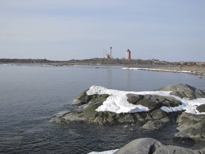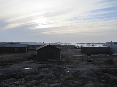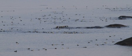 Pujahdimme isojen lasten kanssa aamutuimaan katsomaan haahkoja, kun Kalle vielä nukkui. Oli aivan tyyntä. Kiipesimme hotellin pohjoispuolen kallioiden päälle. Meri oli täynnä haahkoja. Hetkeksi tuli hassu olo kuin ne olisivat saartaneet meidät huomaamattamme. Tuhannet haahkat täplittivät merta lähellä ja kauempana, ja niitä seisoskeli lähiluodoilla. Juha yritti äänittää haahkojen mouruntaa, mutta läntisen niemen takaa lipui suuri rahtilaiva, joka ajoi osan linnuista lentoon.