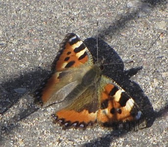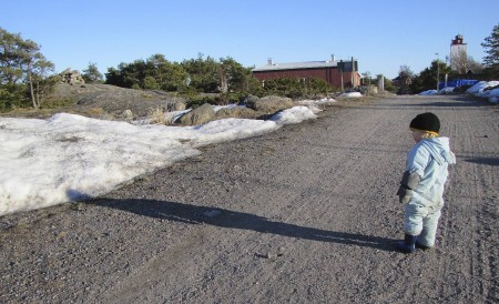 Käärmeiden lisäksi aurinko oli houkutellut esiin nokkosperhosia. Taivas oli pilvetön, ja kevätaurinko tuntui tosi voimakkaalta. Suuren osan ajasta juoksin hakemassa aurinkolaseja mättäiltä ja kivien päältä ja laittelin niitä takaisin päähän. Lapset ovat jo parissa päivässä ruskettuneetkin jonkin verran kasvoista, vaikka olen säännöllisesti laittanut aurinkorasvaa. Vaatteiden pukeminenkin on nyt hankalaa, tyynellä aurinkoseinustalla paahtuu, ja kulman takana tuulisessa varjopaikassa on kylmä.