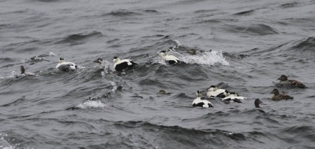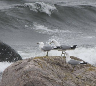 Lähdin keskimmäisen pojan kanssa iltapäivällä aaltoretkelle. Yritin kuvata vähän haahkoja ja kalalokkeja aallokossa. Tuulella on luontoa järjestävä vaikutus. Yhtäkkiä kaikki lokit ovat nokat samaan suuntaan, vastatuuleen. Katselimme jonkin aikaa haahkoja ja pohdiskelimme että onkohan niistä hauskaa keikkua aallokossa ylös alas, vai harmittaako jotakuta, kun ei pääse kunnon soidinvireeseen, ja aina välillä pärskähtää vettä pään yli. Muutama kalalokki kaarteli rantakallioihin murtuvien aaltojen yläpuolella varsin matalalla, niin että niitä pääsi katselemaan ylhäältäpäin. En pystynyt keskittymään lintujen kuvaamiseen, vaikka olin taas Juhan kameran kanssa liikkeellä. Tuuli oli varsin kova, ja eteläkärjessä pitää varoa ettei mene liian reunalle aaltoja ihailemaan, koska vedestä ylös kömpiminen ei taitaisi oikein helpolla onnistua.