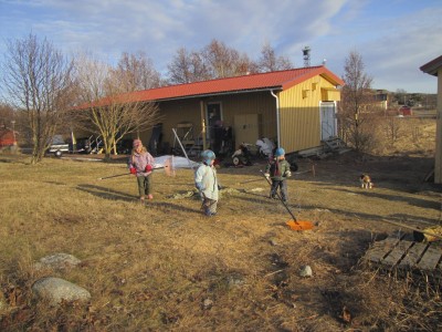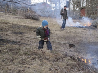 Ilta oli kaunis. Menimme koulun pihalle kulotustalkoisiin. Haravoimme, poltimme vanhoja lehtiä ja ruohoa, ja kulotimme pihaa. Lapset olivat innoissaan. Lopuksi nuotiolla paistettiin makkaraa. Pari ristisorsaa uiskenteli koulunlahden pohjukassa kauniissa iltavalossa. Kotipihalla tarkistimme vielä että huuhkaja oli näkyvissä. Keskimmäinen sanoi vielä sängyssä: Näitkö sä, kun mä haravoin tulta. Käänsi kylkeä ja nukahti.
