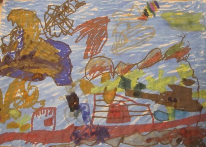 Keskimmäinen lapsista teki veljelleni lahjaksi hienon piirustuksen Utöstä. Oma kertomuksensa kuvasta: ”Kaikki on veden alla, koska Utön saari on ennen ollut veden alla. Tykissä kasvaa vesikasveja. Keskellä oleva rakennus on kauppa. Hai on hotkaissut sukeltajan.” – siinä kai ne tärkeimmät.