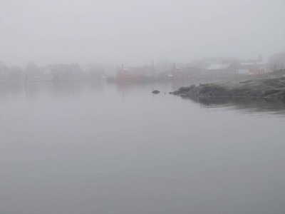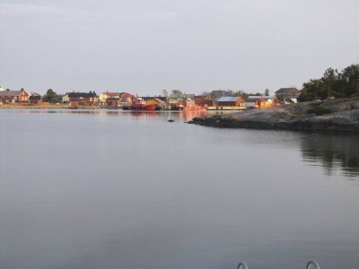 Sumuinen aamu kirkastui illaksi, ja ilta-aurinko oli komea. Ohessa sama satama illalla kuvattuna, joka on aamulla sumukuvassa.