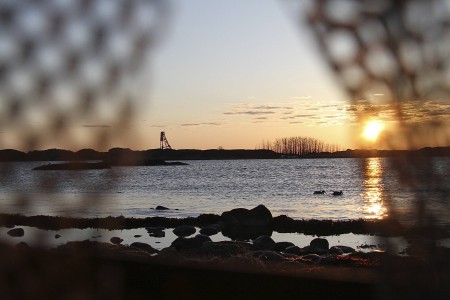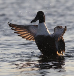 Seitsemän aikaan ajattelin, että tilanne on hallinnassa, ja linnut jo hyvin kuvattu. On aamukahvin aika. Jos olisin tuntenut lapasorsien elämää tarkemmin olisin ymmärtänyt, että koiraiden kiihtyvä päiden nyökyttely tarkoittaa sitä, että uhkailuista siirrytään suoraan toimintaan. Niinpä myöhästyin kameroineni kun linnut tappelivat aivan kojun edustalla. Itse asiassa onnistuin myöhästymään kaksi kertaa (ei ehkä luontokuvaaja- ainesta?). Onneksi jäin vielä hetkeksi kojuun, koska kolmannen kiistan alkaessa ehdin ottaa muutaman kuvan. Koiraiden kiistelyyn kuului toisen takaa-ajoa, siipien levittelyä ja yleistä pullistelua, pään kohottelua ja nikottelua. Rannan oikeassa laidassa ruokaillut koiras näytti voittavan joka kerta. Vasemmanpuoleinen pari siirtyi lopulta kauemmas vasemmalle jatkamaan ruokailua. Aamun tunnelma jäänee mieleen pitkäksi aikaa.