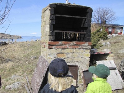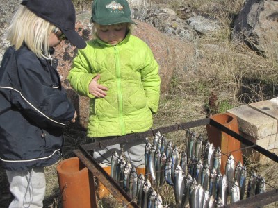 Maanantai oli hellepäivä, tyyni ja kaunis. Vietimme aamupäivää koulun rannassa savustaen tuoreita silakoita. Pojat olivat innokkaana apuna, kun silakoita pujotettiin roikkumaan savustusrautoihin. Välillä lapset kävivät koulun pihalla leikkimässä hiekkalaatikolla. Saaressa oli leikkikaverina myös 2-vuotias tyttö. Söimme lämpimiä kullanruskeita silakoita heti rannassa, ja lounaaksi lisää paistettuna. Keskimmäisen herkkua ovat paistetut pyrstöt.