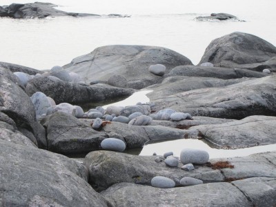 Kiertelimme saaren itärantaa. Haahkanpesiä ei näkynyt ollenkaan, eikä muitakaan pesiä. Yksittäinen kyy luikerteli vastaan, mitenhän sekin on sinne meren keskelle päätynyt. Muutamassa kalliolammikossa näkyi sammakonkutua. Saaren itärannalla oli suuria pyöreitä kiviä (raaskin jättää ne kuitenkin paikalleen!). Söimme eväitä hyvällä näköalapaikalla. Erityisesti kahvi ja suklaa sopivat tunnelmaan loistavasti.