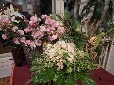 Näyttely on nyt purettu, ja tila valmiina seuraavia taiteilijoita varten. Tapasin näyttelypäivinä työkavereita, tanssikavereita, opiskelukavereita, koulukavereita- jopa vuosien takaa- sukulaisia, ystäviä, luontoharrastajia, radion kuuntelijoita, vaellustutunkin ja tietenkin paljon tuntemattomia näyttelykävijöitä. Ihana puoli näyttelyn pitämisessä! Tauluja ja mukejakin myin paljon enemmän kuin olisin ikinä uskonut. Ja miten ihania kukkia- olen kuin tuoksuvassa viidakossa täällä kotona. Kiitos kiitos kaikille kävijöille.